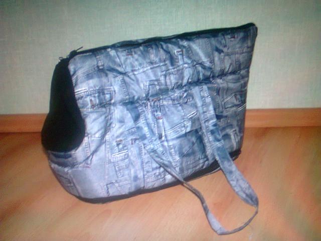 Ilgis 45cm. Džinsinės medžiagos imitacija. Iš abiejų pusių yra kišenės, viduje augintinį galima prisegti. Mažai naudota. Galima derėtis dėl kainos.