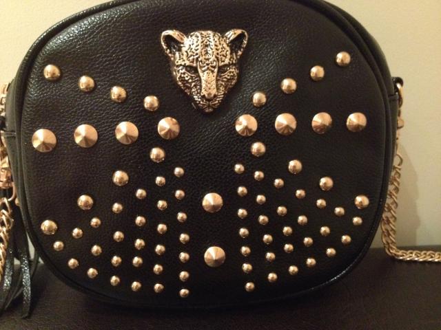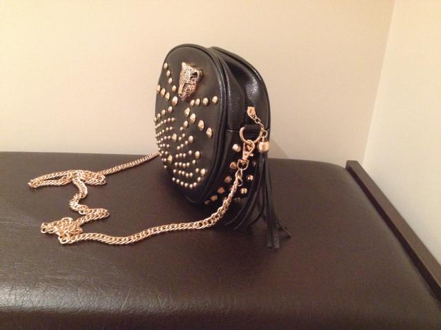Nerealiai stilinga, originali rankinė / delninė. Su aukso spalvos kniedėmis ir leopardo galvos dekoru. Su nusiimančia aukso spalvos grandinėle-rankena