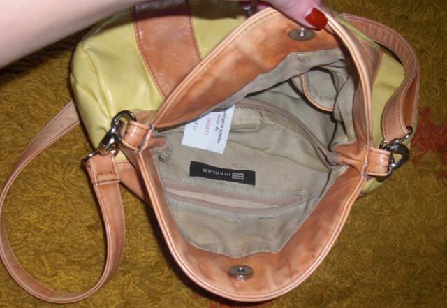Labai grazi rankine is monton. Moketa 100lt. Ryskiu spalvu, orandzine ir geltona. Rankena reguluojasi galima persimesti per pety ar deti ant peties :) Viduje pamusaliukas kiek murzinas, seip netviska lyg nauja, taciau jokiu defektu dideliu nera, visdar pu