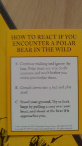 Trauki kortelę su klausimu, perskaitai klausimą ir atskaymus varžovui, šis spėja kuris atsakymas teisingas. Klausimų pobūdžiai - išlikimo. Ką daryt kai vejasi ryklys, kaip sutvarstyt koją, kur slėptis nuo bičių ir pan.
