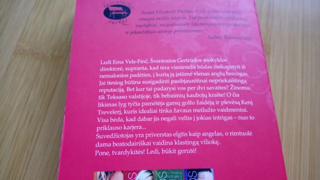 Ledi Ema Vels-Finč, Šventosios Gertrūdos mokyklos direktorė, supranta, kad tėra vienintelis būdas išsikapstyti iš nemalonios padėties, į kurią ją įstūmė vienas anglų hercogas. Jai tiesiog būtina susigadinti pasibjaurėtinai nepriekaištingą reputaciją. Bet kur tai padarysi vos per dvi savaites? Žinoma, tik Teksaso valstijoje, tik bebaimių kaubojų krašte! O čia likimas lyg tyčia pamėtėja garsų golfo žaidėją ir plevėsą Kenį Trevelerį, kuris idealiai tinka žavaus meilužio vaidmeniui.