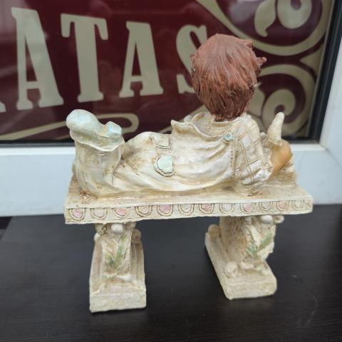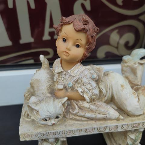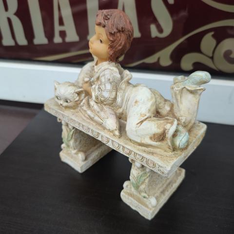 Sustiprinto plastiko pluošto kompozicija Berniukas su katinėliu ant suolo.