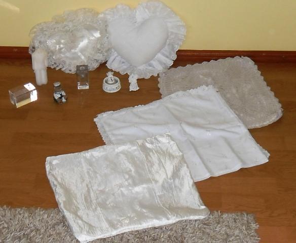 kaip nauji suvenyrai ir pagalvėlių užvalkaliukai, pagalvėlės, angeliukai ir meškiukas po 2 lt, pagalvėlių užvalkaliukai visi kartu 6 lt, dvi sirdutes formos pagalvėlės 10 lt, stiklinė zvakidė 4 lt, stiklinis Londono vaizdas-6 lt, siunciu po kelis vienetus ne po vieną.