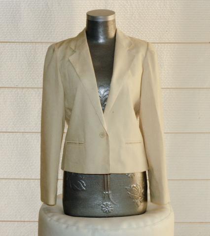 Švarkelis lengvas, neblizgios lengvos medžiagos, primenančios liną, smėlio spalva 42 dydis, susisega viena saga, nešiotas, tačiau puikios būklės. :)