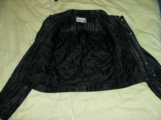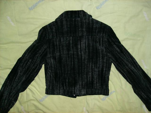 Juodas raštuotas švarkelis. maždaug XS-S dydžio, trumpas, tačiau jeigu ūgis apie 160cm tai jis būna normalaus ilgio, trumputis būna esant apie 176cm. priekyje yra dvi kišenėlės, užsegamas sagutėmis. viduje su pamušalu. Ganėtinai šiltas. Nešiotas nedaug.