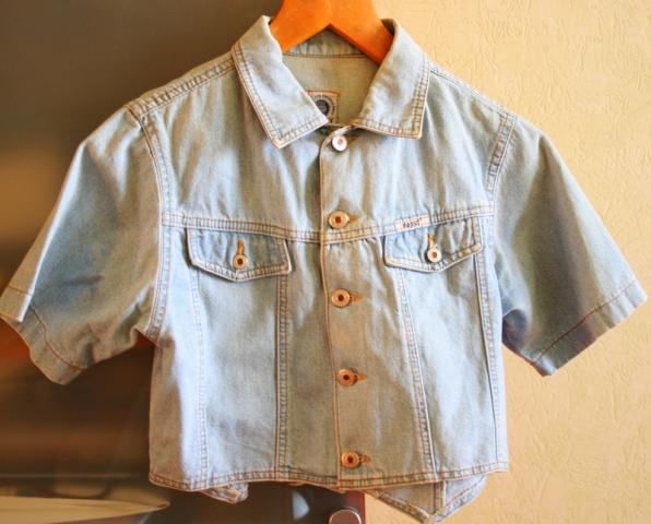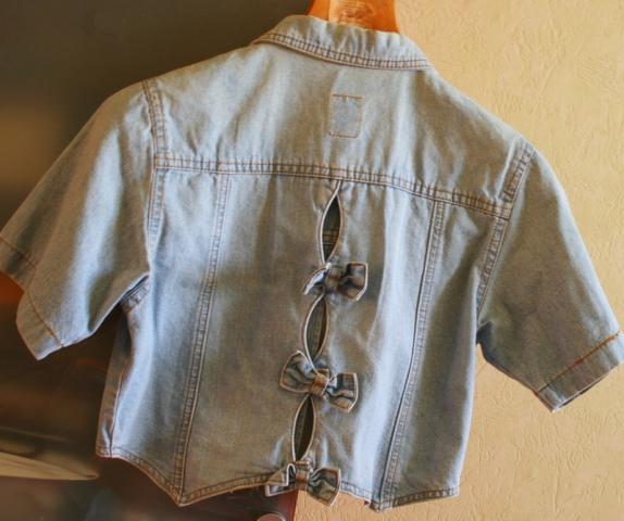 Džinsinis švarkelis su kaspineliais nugaroje.