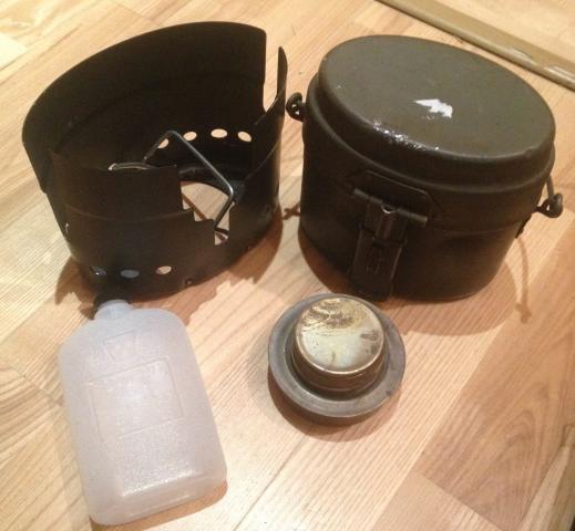 Švediškas kariuomenės katiliukas. Talpa apie 1.5 l. Dangtelis gali būti patogiai naudojamas kaip keptuvė, tvirtinima prie pagaliuko (vietoj rankenos). Ypač patogus, lengvas aksesuaras stovyklaujant. Kartu su degikliu, plastikine talpa kurui (jei būsi geras, pridėsiu ir kuro) ir stovelių katiliukui.