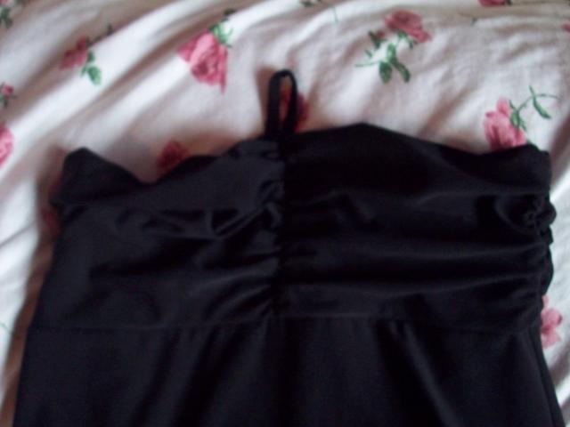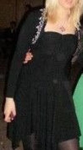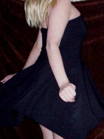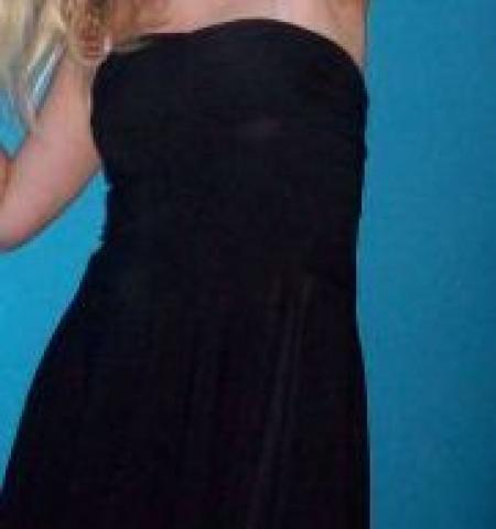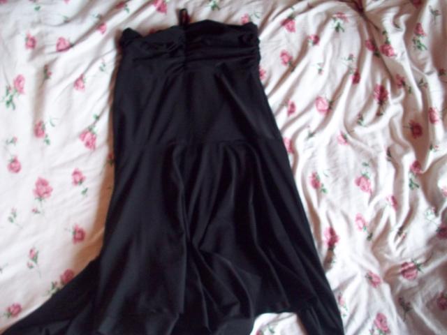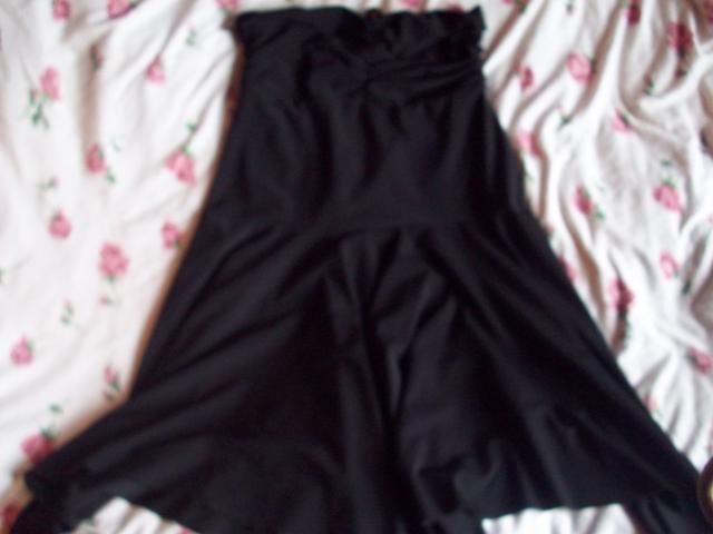 Juoda labai graziai krintanti ant kuno suknele. Tik nera juosteles, kuri risasi ant kaklo, bet uzlenkus arba nuemus kilpele dar graziau nesiojasi be jos