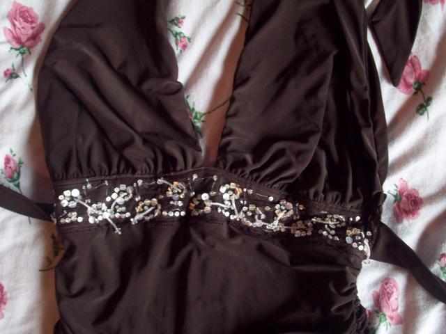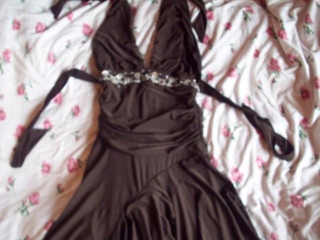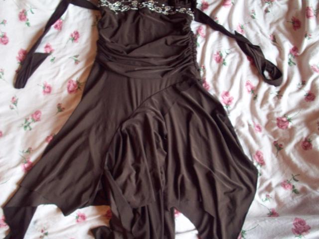 S/M dydzio sventine suknele dekoruota karoliukais. Risama per kakla ir nugaroje. Graziai krinta ant kuno