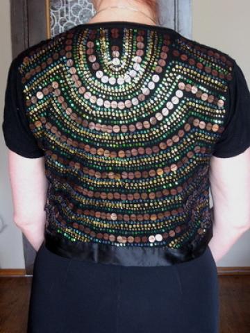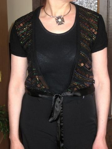 Juodas BOLERO. Priekyje užsiriša atlasiniu kaspinu. Priekis ir nugara dekoruota blizgučiais.