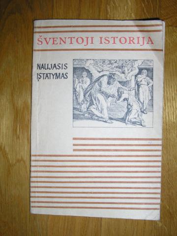 Sventoji istorija (Naujasis istatymas) 1947m laidos fotokopija 1990m tinka ruosiantis pirmajai komunijai. Paskutinė vakarienė, Marija patepa kristų, Pas Zakiejų, Iškilmingas įžengimas Jeruzalėn, kristaus npranašavimai, Paskutinis teismas, Pas Pilotą ir Erodą, Jėzaus mirtis, ir kt.