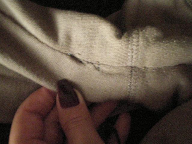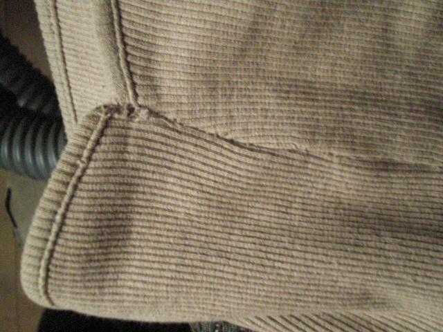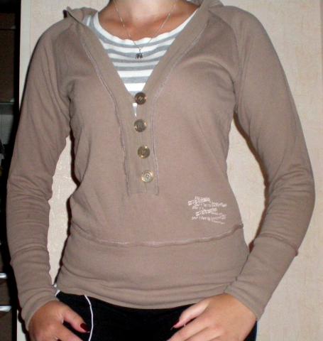 Šviesiai rudos spalvos džemperis su kapišonu. Dydį rašo L, tačiau buvo siaurintas, todėl dabar tinka S/M. Tikrai fainutis ir patogus. BET yra nemažai defektų: daug kur matosi siaurinimo siūlės (baltos ir juodos spalvos), kai kur net prairimai yra, ir dar panašiai ant pilvo yra maža skylutė (viskas nuotraukose matosi). Džemperis nešiotas nemažai. Gavau jį per mainus (jo vertė buvo 15lt). Išmatavimai: per krūtinę ~ 47*2 cm; per liemenį ~ 40*2 cm; rankovės ilgis nuo pažasties ~ 56*2 cm; bendras ilgis ~ 64 cm.