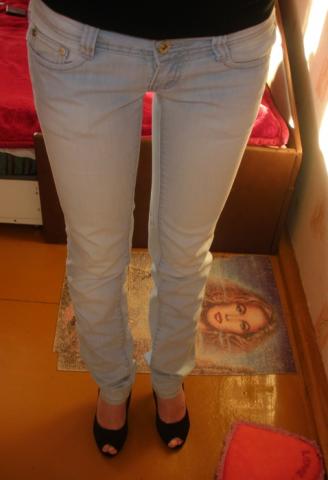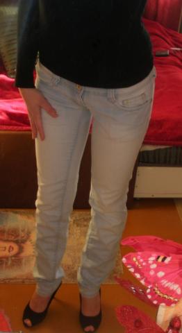 Šviesūs džinsai, dailiai priglunda. Man truputį per ilgi (mano ūgis 1,64m). Fotografuota ant tokio sudejimo: klubai 80 cm, uzpakaliukas 88 cm.