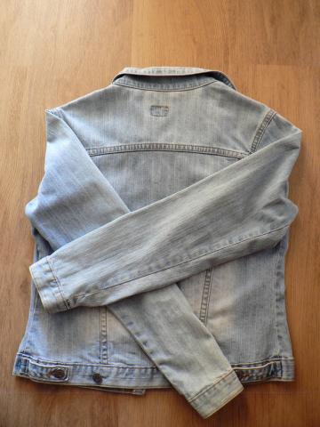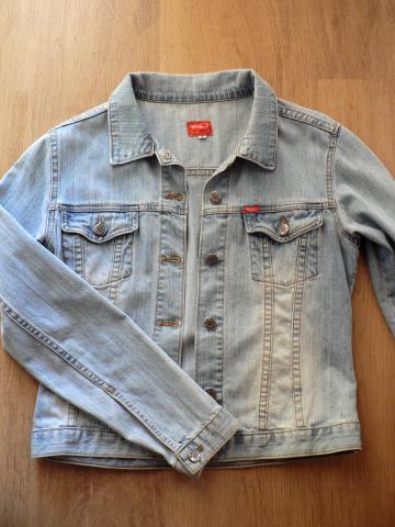 Šviesus "Westman" džinsinis švarkelis. Nurodytas L dydis, bet galbūt tiktų ir platesnių pečių M. Pečiai: 12,4 cm (skaičiuojant nuo apykaklės siūlės iki pečių siūlės), rankovės: 61,5 cm, ilgis iš nugaros: 53 cm.