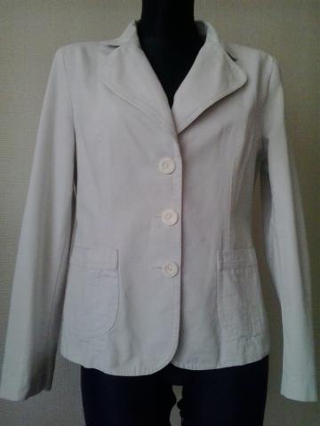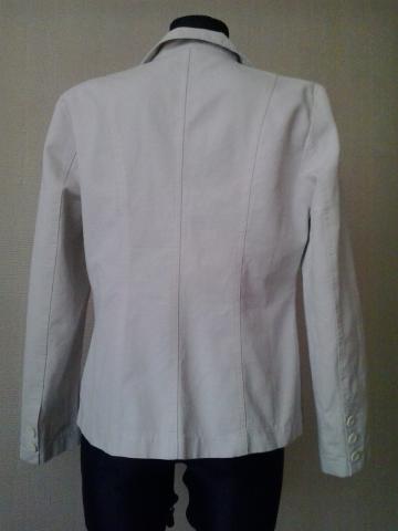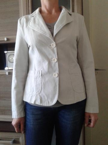 Švarkelis pieno baltumo, susegamas trimis sagomis, yra dvi kišenės, be pamušalo. Tai lengvas rūbas vėsesnei vasaros dienai ar pavasariui. Dydis 42. Išmatavimai: ilgis - 60 cm, pečiai - 40 cm, rankovės - 60 cm, krūtinės apimtis - 46*2 cm. Audinys - 100% cotton.