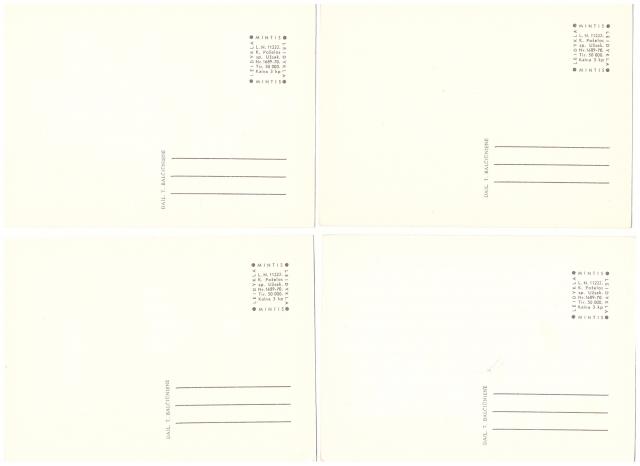 T. Balčiūnienės atvirukai ~1970 Leidykla: Mintis Nr. 1689-70 Nenaudoti Dydis 14,5X10,5 cm Vieneto kaina - 1.45EUR. Dėl daugiau informacijos rašykite.