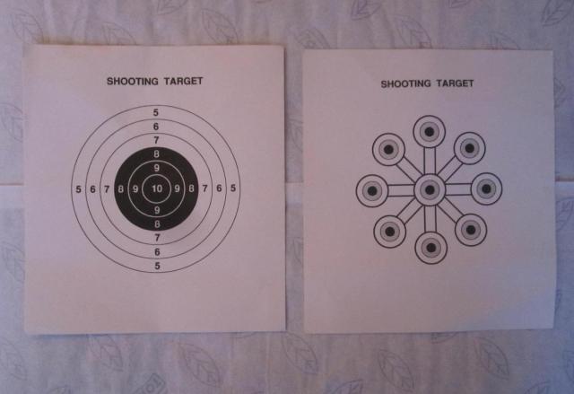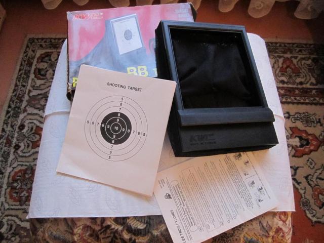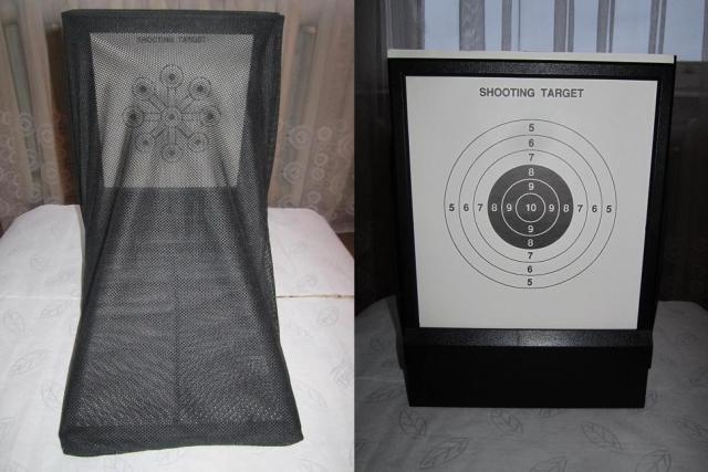 Puikus, praktiskai naujas, nesulauzytas ir be menkiausiu defektu nesiojamas taikinys. Padarytas is plastiko. Specialiai sukurtas saudyti i ji namu salygomis, bet galima ji naudoti tiek lauke, tiek ir kitur. Turi apsaugini tinkliuka, kuris sulaiko issautas kulkas. Pilnas komplektas matosi nuotraukoje Nr. 7. Pridesiu 5vnt. pakeiciamu popieriniu taikiniu