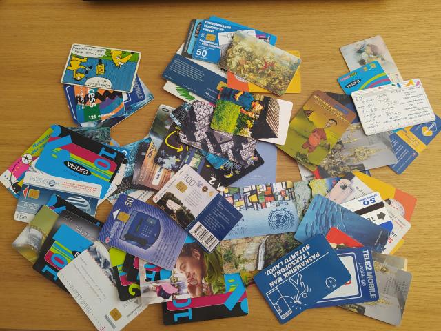 Įvairių šalių taksofonų ir telefonų papildymo kortelės, sim kortelės. Viso 69 vnt. Daugiausiai lietuviškų, yra vokiškų, rusiškų, švediškų, pora lenkiškų, po vieną latvišką, estišką ir graikišką