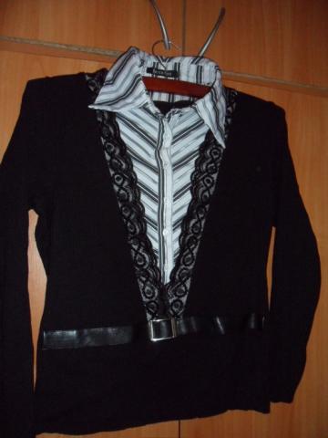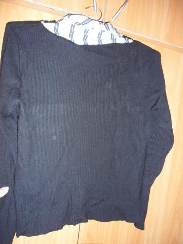 deveta gal pora kartu,nes prie didesnes krutines bliuskute daugiau issitempia ir sutrumpeja ilgis,tad ir stovi spintoje.Juoda,tampri,su graziais raukinukais,uzsidedavau i ofisa.Atrodo,kaip marskinukai su megztuku,bet tai vientisa.Tvarkinga,jokiu devejimo zymiu nera.Ismatavimai:ilgis 52cm,rankoves nuo peties 55cm,nuo pazasties 44cm,per krutine 42cm-56cmKaina jau su siuntimo islaidomis