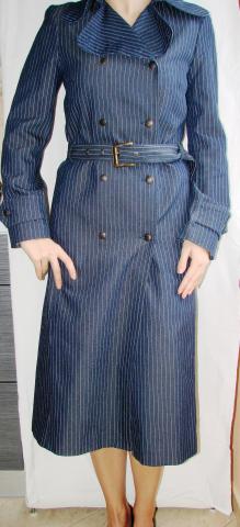 Nuostabus geros būklės ploščius. Tamsiai mėlynas su smulkiais dryžiukais, susijuosia diržu. Pats tas ankstyvam pavasariui. Dydis parašyta 42, bet aš nešioju 38, ir man puikiai tiko. Išmatavimai: per krūtinę 43cm., ties liemeniu 39cm., ilgis priekyje maždaug 116cm., rankovių ilgis nuo peties 61cm.