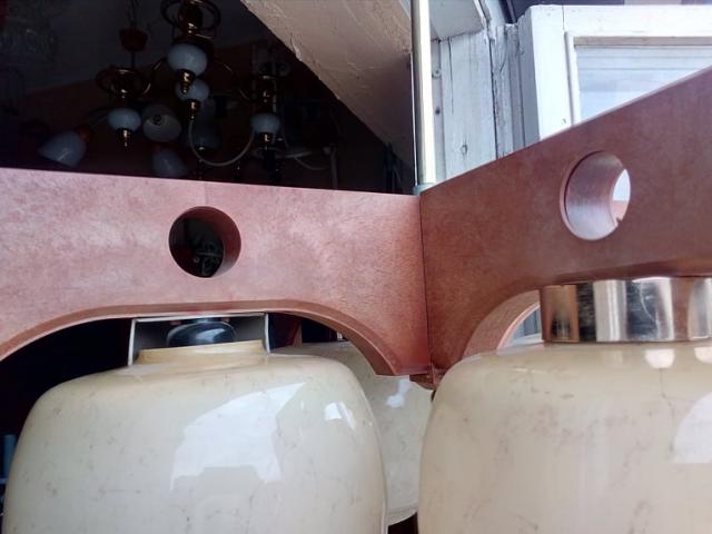 Plastmasė. Medžio imitacija. Stikliniai gaubtai. Turi smulkų defektuką, nulužusi dalis plastmasinio patrono uždengimo.