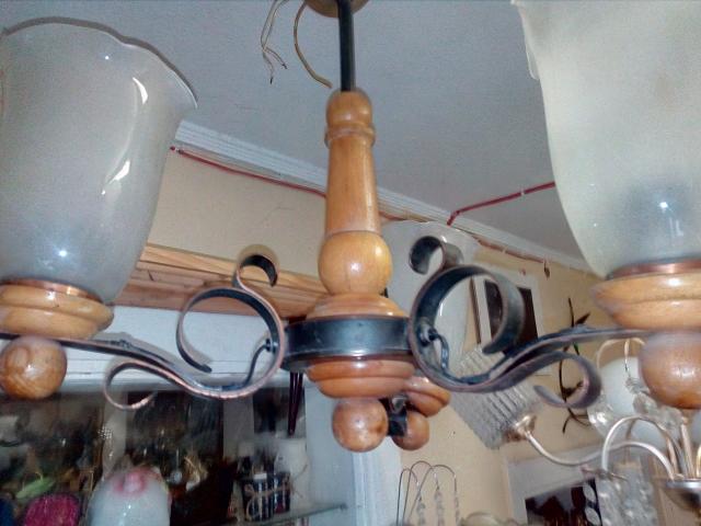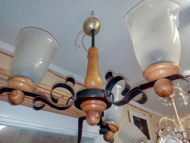 Tarybinis žalvarinis su medžiu trijų lempų šviestuvas.