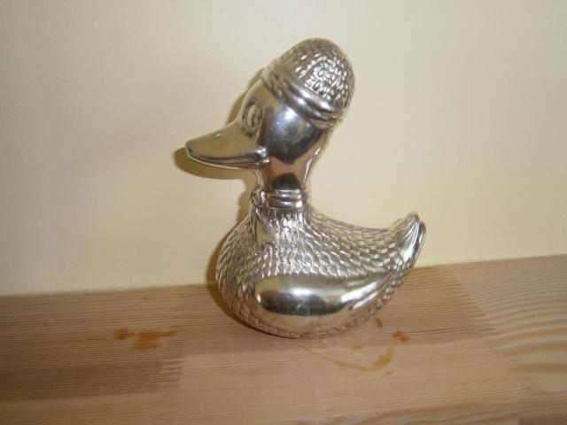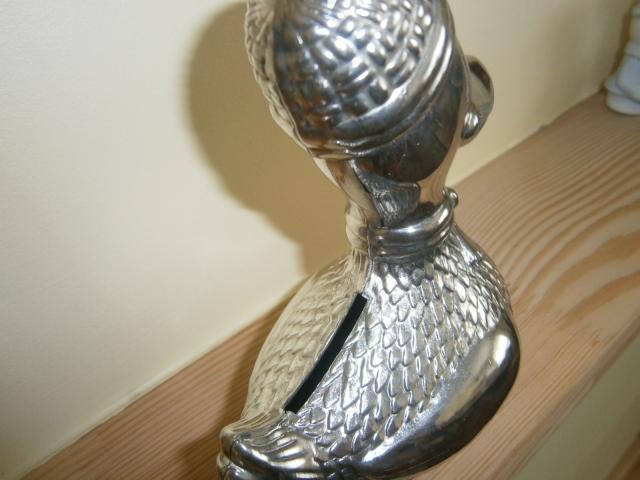 Sena, bet puikiai išlaikyta taupyklė. .Sidabro spalvos metalas, puikiai valosi sidabriniams daiktams skirtu valikliu.Metalas primena kinietiškus sidabruotus indus. Apačioje nėra uždarymo, bet tai išspręsti paprasta