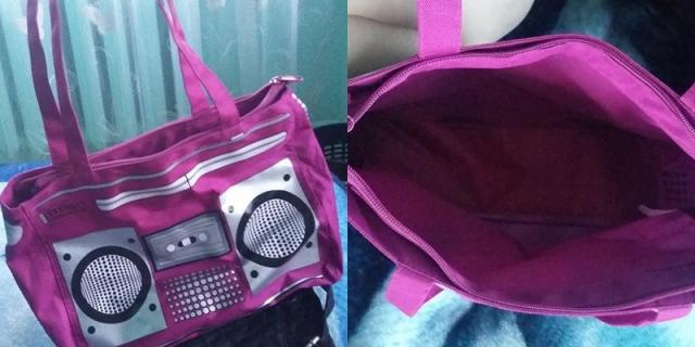 Tašė tinka prie upės ar taip kur prie vandens. Rožine su radijos paveiksleliu