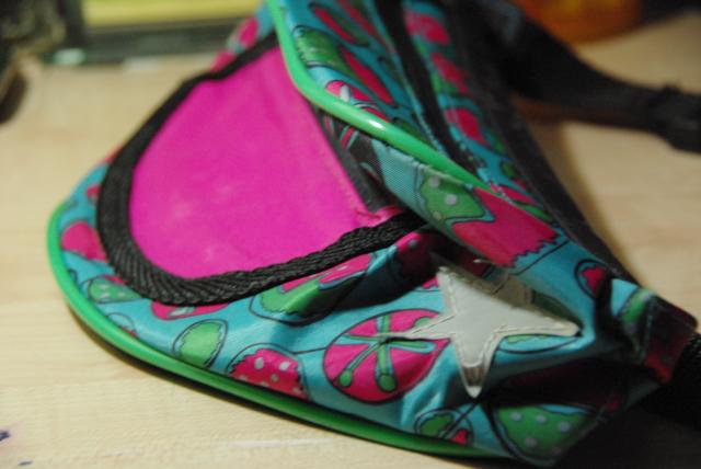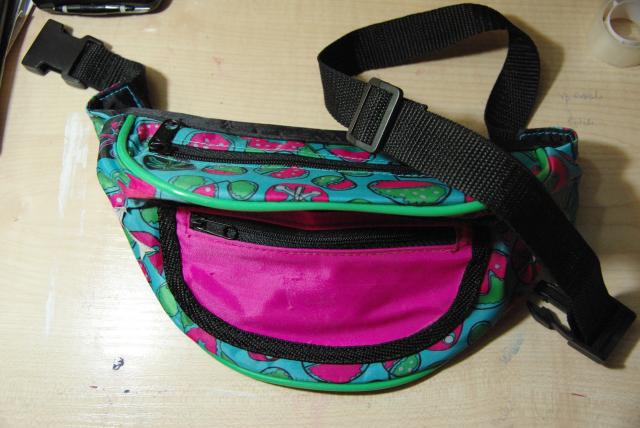Spalvotas tašiukas per liemenį.