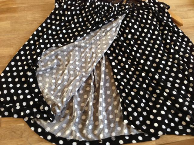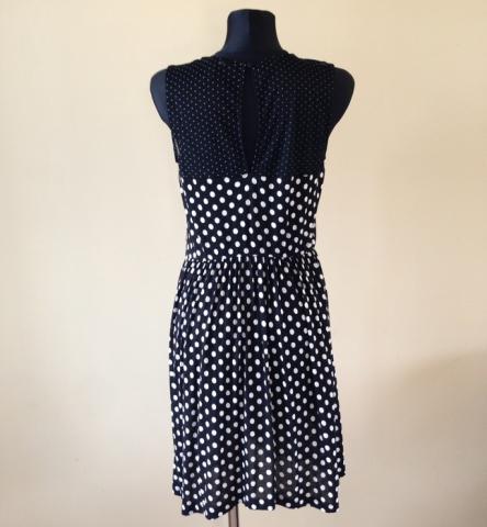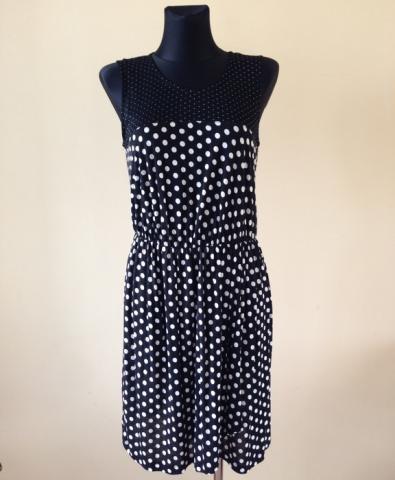 *dydis: 42/14; *klasikinė taškuota suknelė; *juosmuo su guma; *smagus audinys ir modelis; *sijonas tarsi susiaučiamas; *ilgis nuo juosmens: 50cm; *bendras ilgis: 95cm; *vilkėta vieną kartą; Sudėtis: 100% viskozė; tiulis: 100% poliesteris;