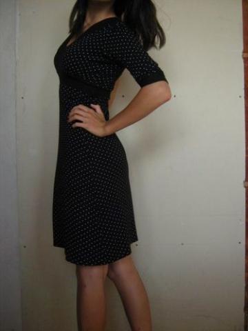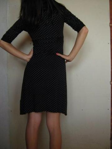 S/M dydžio, smulkiai taškuota, trikotažinės medžiagos. labai miela ir daili, bet na, mano skoniui dabar jau per ilga ( :