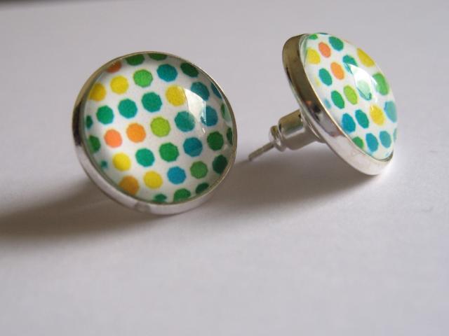 Auskariukai padaryti naudojant Collagen'o techniką. Auskariukų piešinėlis - tai paveikslėlis perkeltas ant fotopopieriaus ir uždengtas permatomu kabošonu. Auskariukų užsegimas sidabro spalvos.