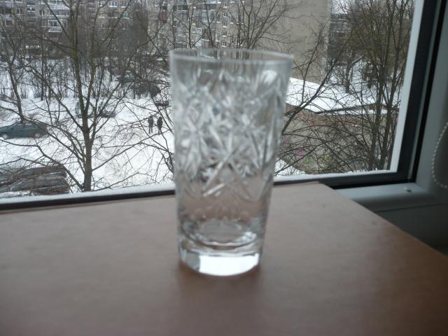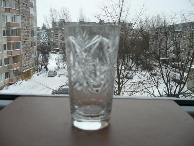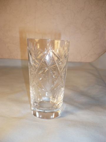 Krištolinė čekiško tarybinių laikų krištolo taurė-stiklinė, nenaudota. Pagrindas 1,5 cm storio, briaunuotas, atrodo kaip veidrodinis, todėl ji stabiliai stovi. Visa gražiai išgraviruota, ko niekaip nepavyko nufotografuoti nei dienos šviesoje, nei prie elektros. Aukštis-11 cm. Pagrindo skersmuo 4,5 cm, viršaus skersmuo 6 cm. Kaina 7 €
