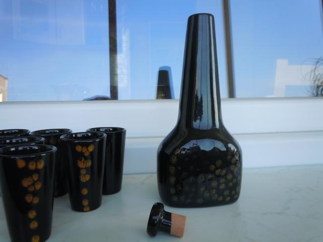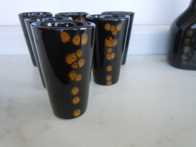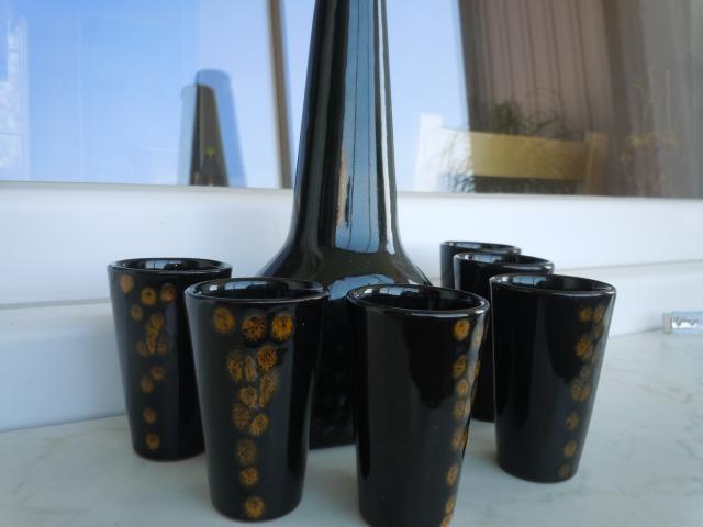 Senovinis, molinis glazuruotas 6 taureles - 7cm aukščio ir 4,5 cm skersmens 1 grafinėlis su kamšteliu - 19,5 cm aukščio ir apačia jo 5,5 cm*8 cm
