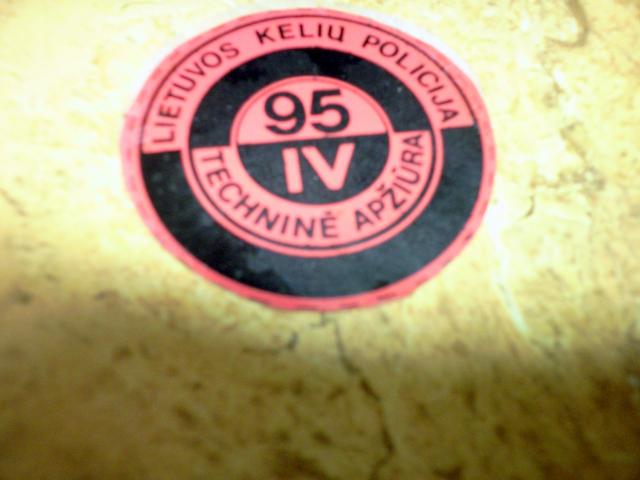 Technines apziuros lipdukas 1995 m., klijuojamas ant automobilio numeriu.