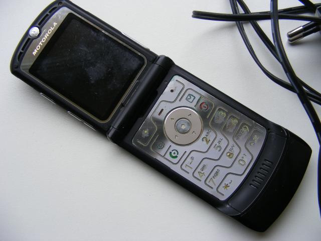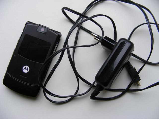 Motorola telefonas su pakrovėju. Senas, bet veikiantis.