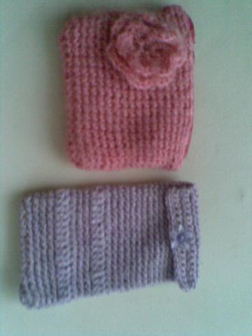 Rankų darbo nerti telefono įdėklai ir rožinė piniginytė. Juos nėriau pati. Darbai yra visiškai nauji, be defektų. Telefono įdėklas violetinės spalvos kainuoja 8Lt, mėlynos spalvos - 7Lt, piniginė - 10Lt.