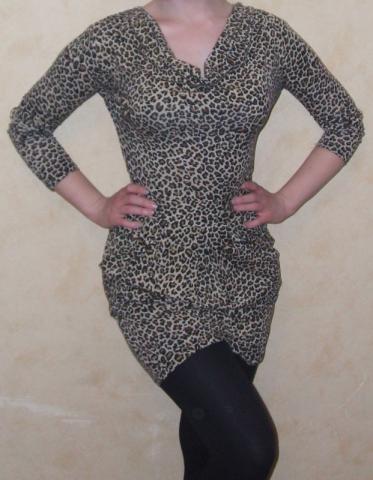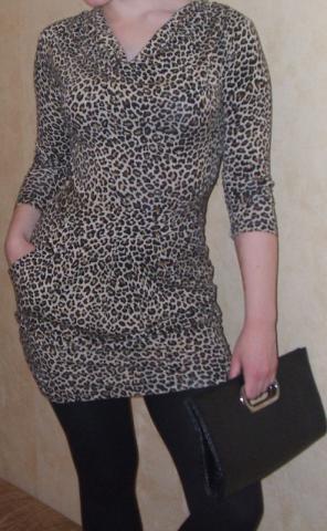 Tigrinė ,aptempta suknelė.Šonuose yra kišenės ,priekis paklostuotas, labai gražus modeliukas. tinka S/M