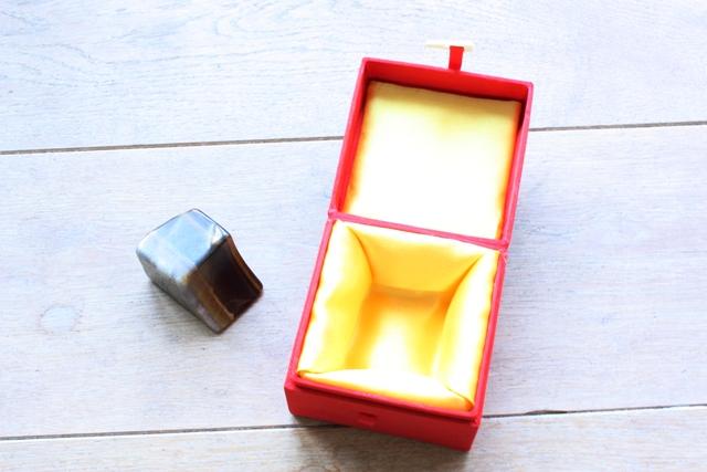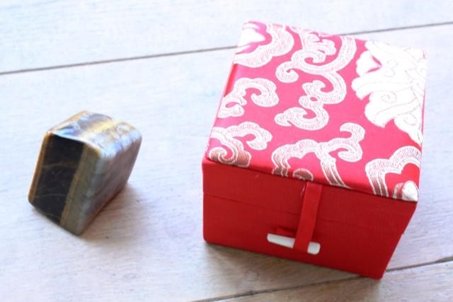 Kelių centimetrų skersmens nugludintas tigro akies akmuo iš Kinijos, su gražia dėžute.