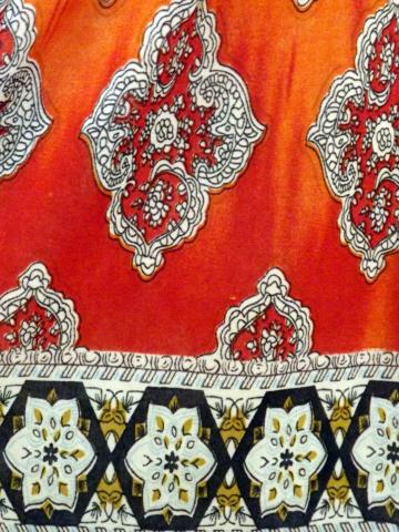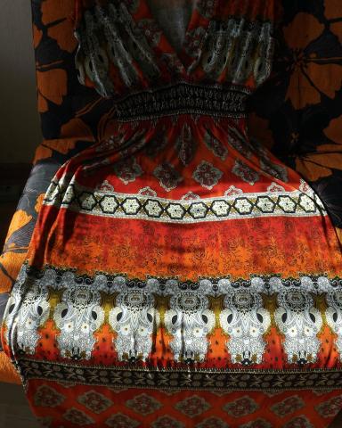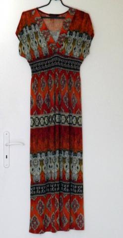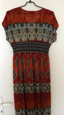 Ilga, įvairių, ryškių raštų suknelė. Nešiota vieną kartą. Bendras ilgis - 140cm. Plotis per suraukimą - 33cmx2(neištempus) Plotis per suraukimą - 68cmx2(ištempus) Tinka M/L/XL/XXL dydžiams