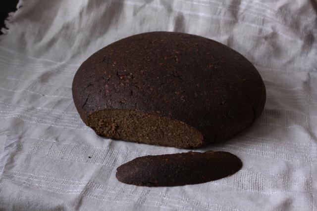 Juoda, rupi, skalsi. Viso grūdo ruginė iš ekologiškų miltų. Ruošiama taip, kaip senoliai kaimuose ruošdavo. Be mielių ir cukraus. Galim ir su kvietiniais miltais pamaisyt, buna minkstesne. Kepalas iki 5kg. Sudėtis: ruginiai rupaus malimo miltai kmynai druska naminis raugas 1kg - 5eur