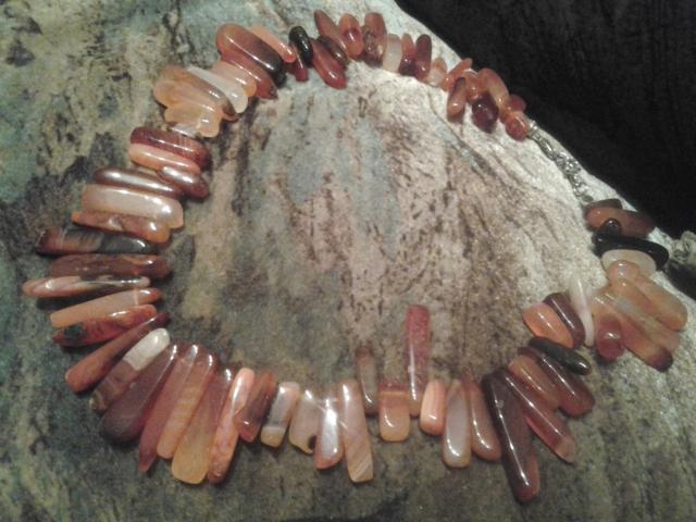 Masyvus karoliai arti kaklo is tikru, svelniu akmenu.