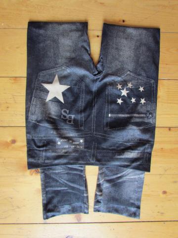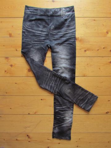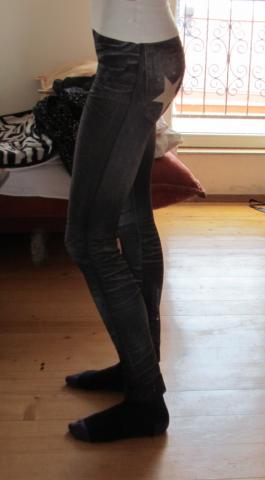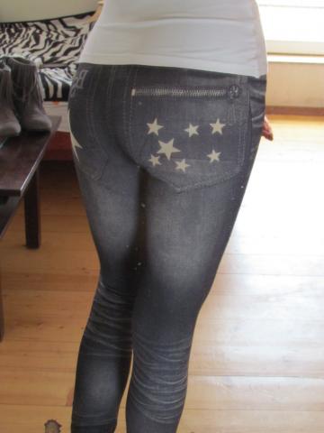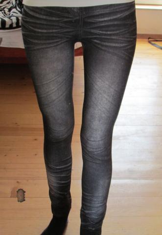 Gavau dovanų, bet man truputį laisvokos, tai susikelia viršun ir negražiai atrodo. Idealiausiai tiktų s/m nešiojančioms. Aš nešioju xs/s. Tamposi, labai maloni medžiagytė, imituoja išblukintus džinsus, išpaišytos "raukšlės" (matyti nuotraukose). Aukštesnio liemens, tai labai patogios. Etiketės nuimtos, bet naujos, tik matavausi kelis kartus.
