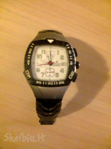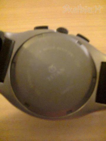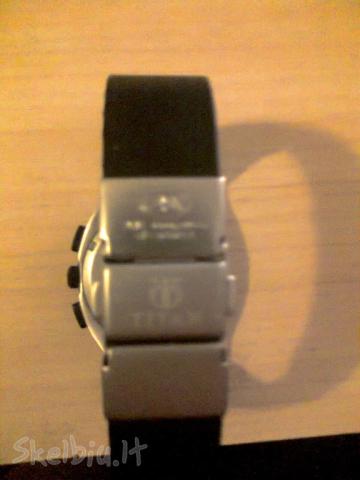 Titan laikrodis. Geros buklės. Devėtas. Su kalendoriumi. Nepraleidžia vandens budamas iki 100 m. po vandeniu. Laikrodis smulkiai rankai netinka, todėl kad apyrankė ilga: 26 cm, tokiai rankai tinka. Laikrodžio strėlytes šviečia tamsoje. Chronografas. Domina mainai ir pinigai. Ant korpuso 5 nuotr. truputi apibraižytą.