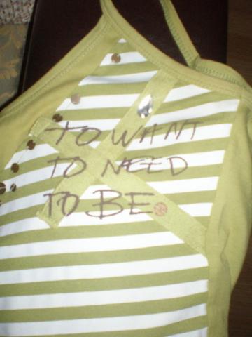 Topikas, žaliai-baltas, su užrašu, to want, to need, to be. Apačioje originalus nukirpimas.