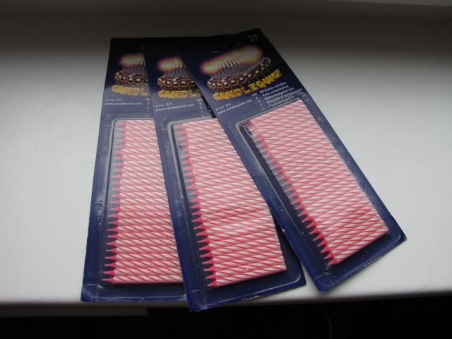 Naujos 75 (3 pakeliai po 25 vnt. ) žvakutės tortui, pirktos jubiliejui, bet liko nepanaudotos:) Savo daiktuose turiu ir žvakučių laikiklį, jei reikia...