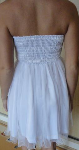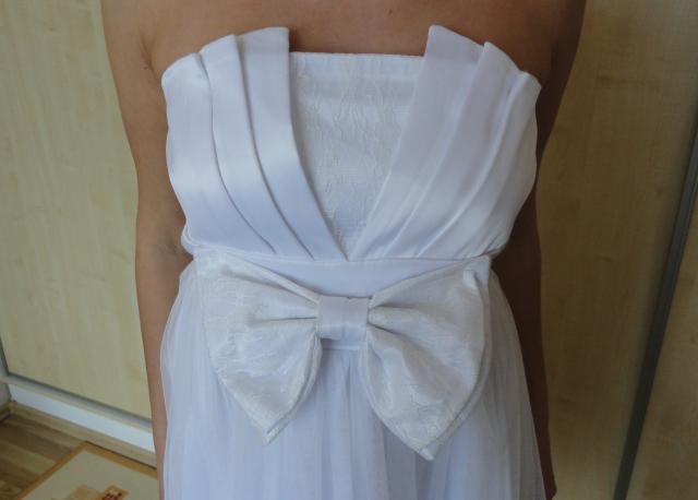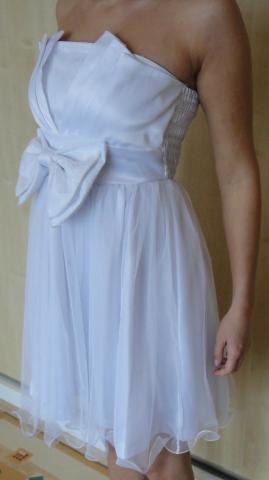 Žaisminga platėjanti suknelė priekyje papuošta kaspinu. Galima prisikabinti petnešėles. Dėvėta tik vieną kartą.