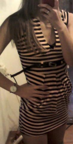 Labai graži suknelė, yra iškirptė (nuotraukose esu pasivilkus juodą maikutę po suknele), gražiai apsitempia, patogi, defektų neturi. (be diržiuko)