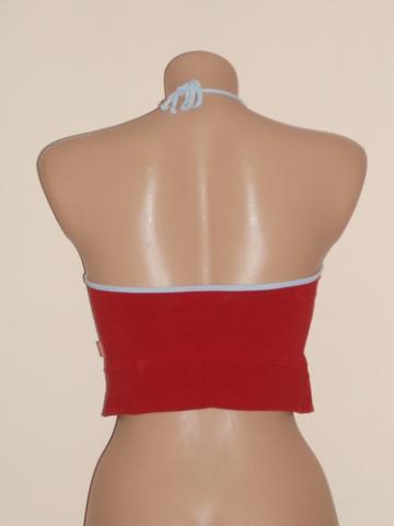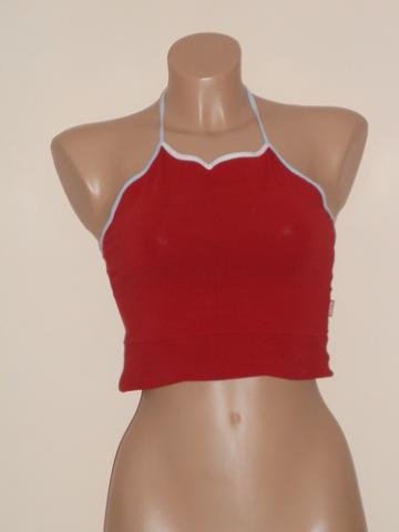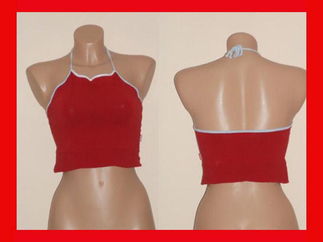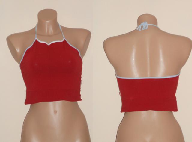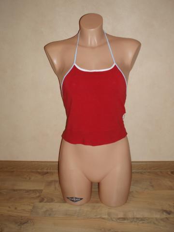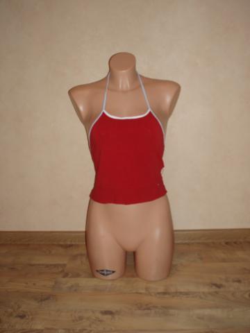 Trumpa bliuskutė, nugaroje per kaklą surišama raištuku, tinka sportuoti. Spalva nenuskalbta. Ilgis bliuskutės šono ~20cm. Ilgis bliuskutės priekyje ~31cm, per liemenį ~ 70cm (dar šiek tiek tempiasi). Plačiau: http://www.manodrabuziai.lt/drabuziai/moteriski/marskiniai-palaidines/palaidines-be-rankoviu/1196668-trumpa-bliuskute-lolita