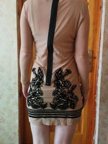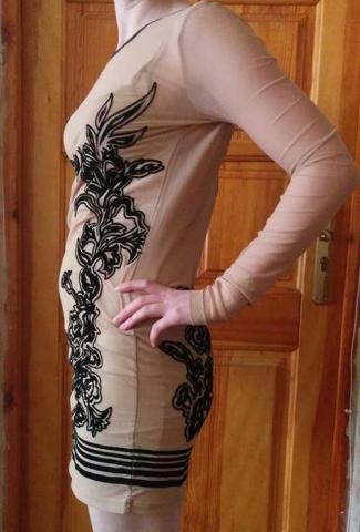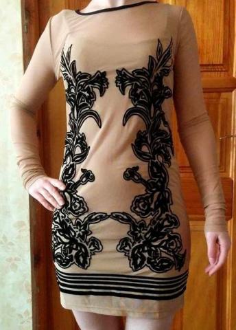 Trumpa suknutė, gali būti nešiojama kaip tunika. Vidinė dalis trikotažinė,ant šleikučių smėlio/kūno spalvos. Išorinė dalis ilgomis rankovėmis,tinklelio kūno spalvos bei juodais, švelnios medžiagos raštais. Sudėties nežinau, nėra etiketės. Medžiaga tempiasi. Nauja,nedėveta,parsisiųsta. Ilgis nuo pečių - ~79 rankovės ilgis- ~65 krūtinė~ 35x2 klubai ~40x2 pečių plotis ~34 + p.i.